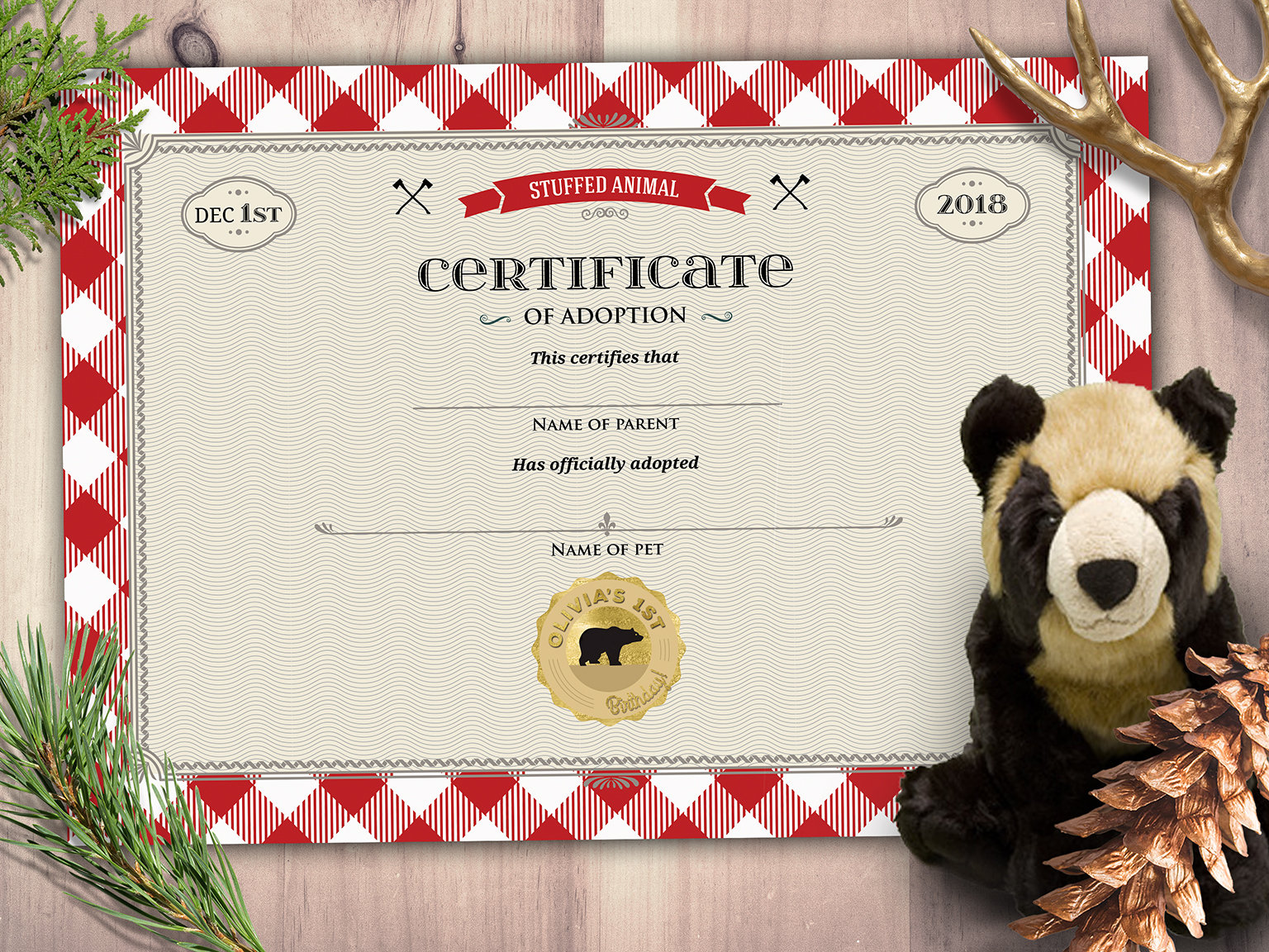 Lumberjack, woodland, party favor, stuffed animal adoption certificate, Buffalo Plaid, Woodland, Lumberjack, Rustic,Bear, Printable file